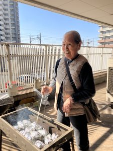 準備ができたら、ベランダのコンロで炭火焼きにします。